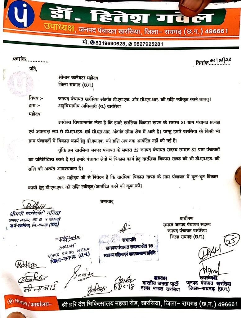 ज्ञापन के माध्यम से जनप्रतिनिधियों ने मांग की है कि खरसिया क्षेत्र की पंचायतों में विकास कार्यों को गति देने के लिए CSR (कॉरपोरेट सोशल रिस्पॉन्सिबिलिटी) और DMF (जिला खनिज न्यास) फंड से राशि उपलब्ध कराई जाए।