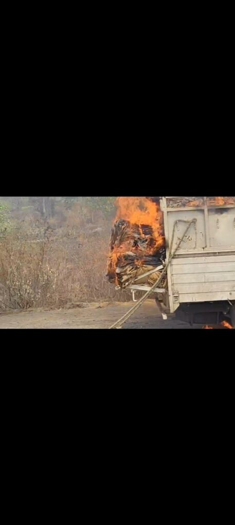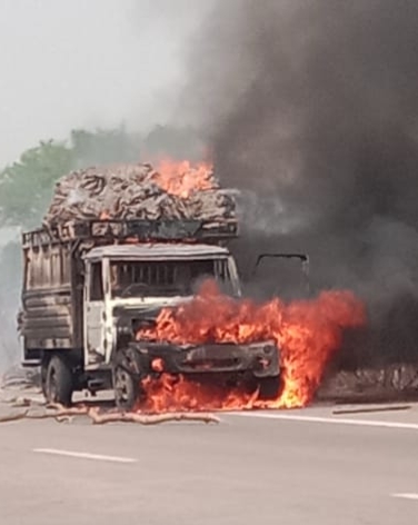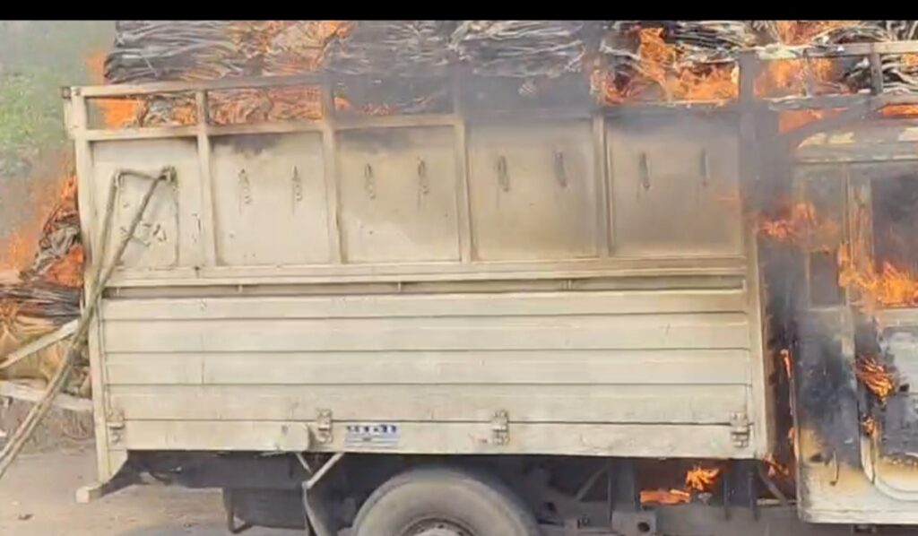 बताया जा रहा है कि सड़क किनारे खेतों में जल रही पलारी की तेज लपटें और उड़ती चिंगारियां पिकअप तक पहुंच गईं। देखते ही देखते बोरियों से भरी पिकअप आग की चपेट में आ गई और वाहन आग का गोला बनकर NH-49 पर दौड़ने लगा।